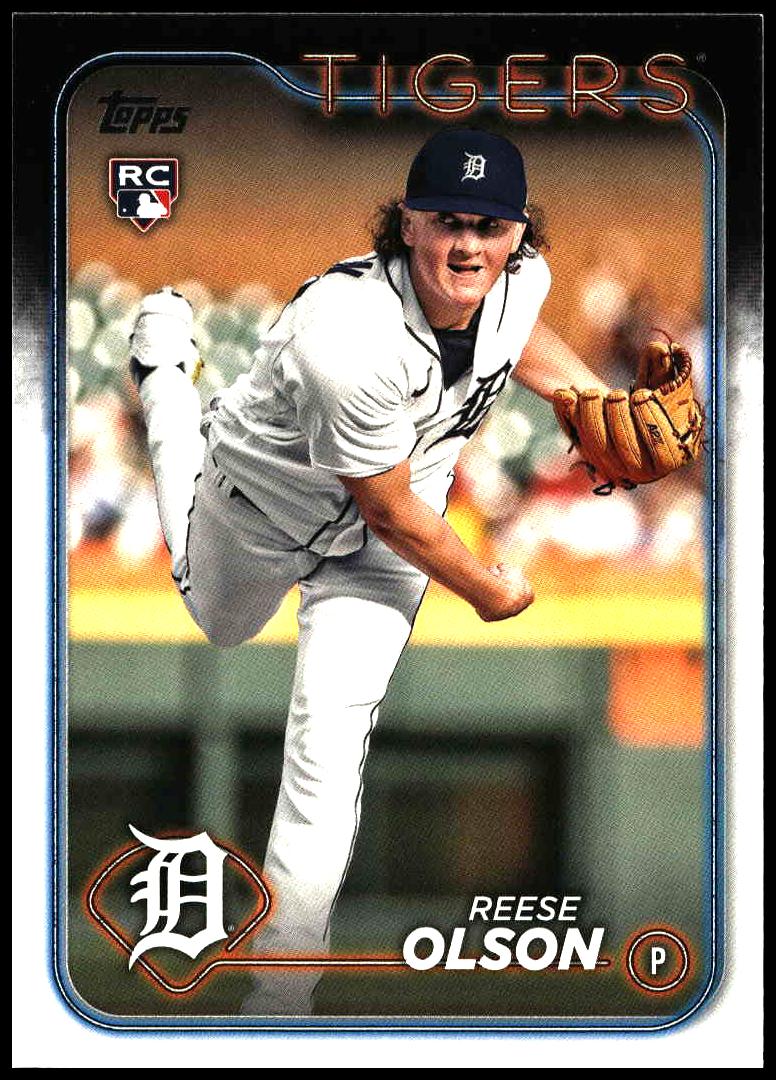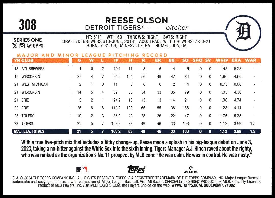 This Baseball card, from 2024 is part of the Topps Series 1 card set. Reese Olson is featured and has a card number of 308.