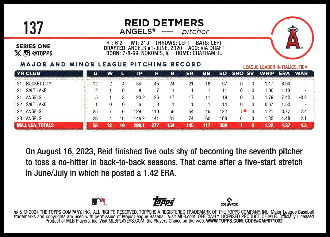 This BaseballΒ card, from 2024 is part of the Topps Series 1Β card set. Reid Detmers is featured and has a card number of 137.