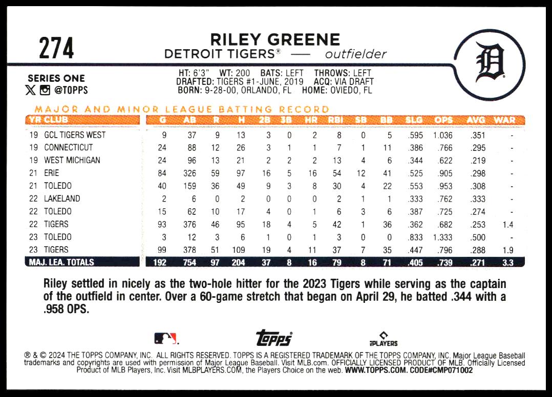 This BaseballΒ card, from 2024 is part of the Topps Series 1Β card set. Riley Greene is featured and has a card number of 274.
