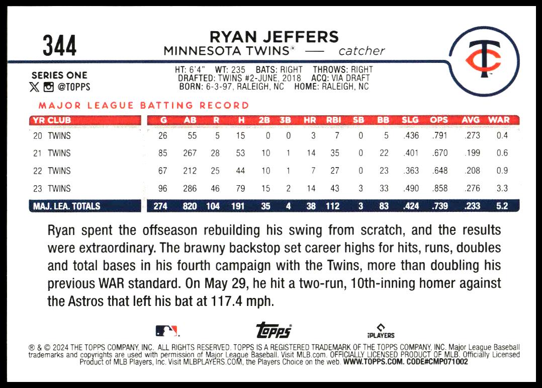 This Baseball card, from 2024 is part of the Topps Series 1 card set. Ryan Jeffers is featured and has a card number of 344.