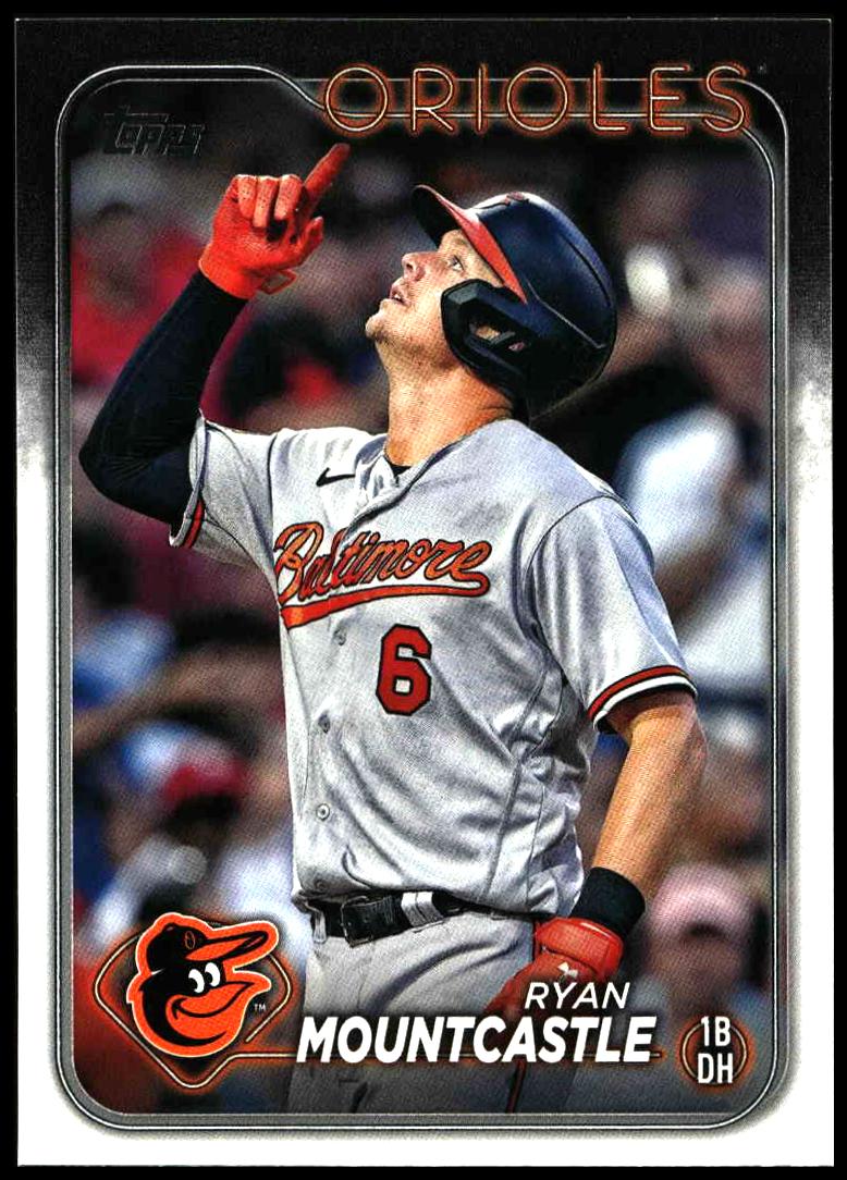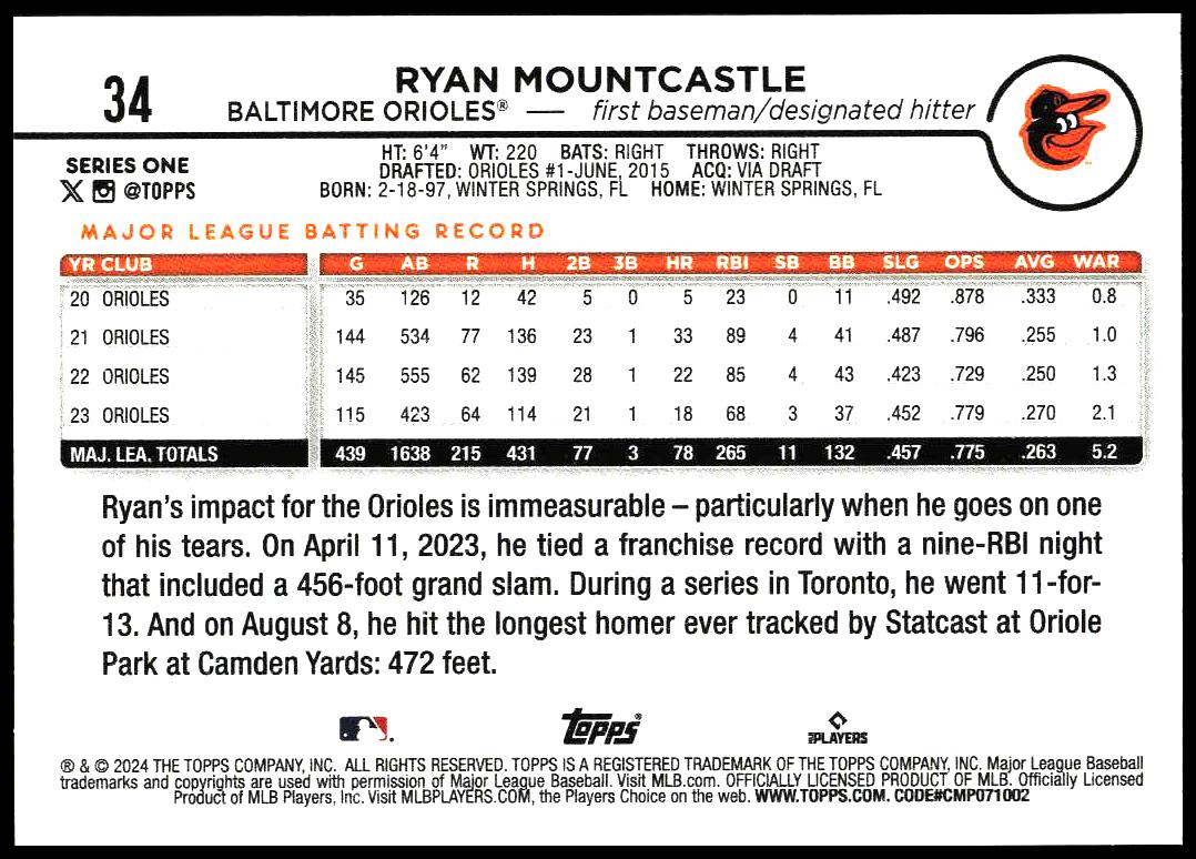 This Baseball card, from 2024 is part of the Topps Series 1 card set. Ryan Mountcastle is featured and has a card number of 34.