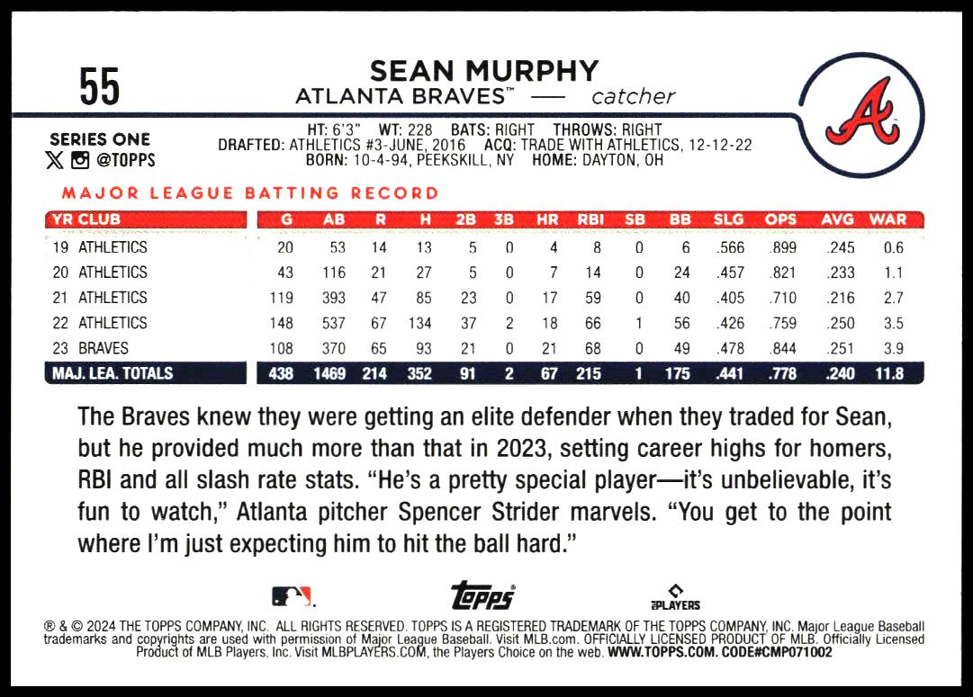 This Baseball card, from 2024 is part of the Topps Series 1 card set. Sean Murphy is featured and has a card number of 55.