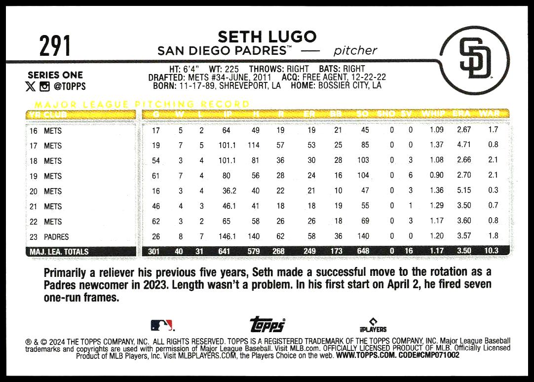 This Baseball card, from 2024 is part of the Topps Series 1 card set. Seth Lugo is featured and has a card number of 291.