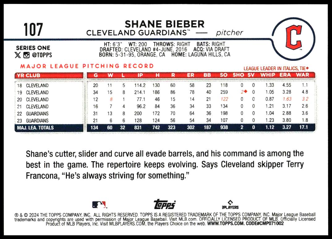 This BaseballΒ card, from 2024 is part of the Topps Series 1Β card set. Shane Bieber is featured and has a card number of 107.