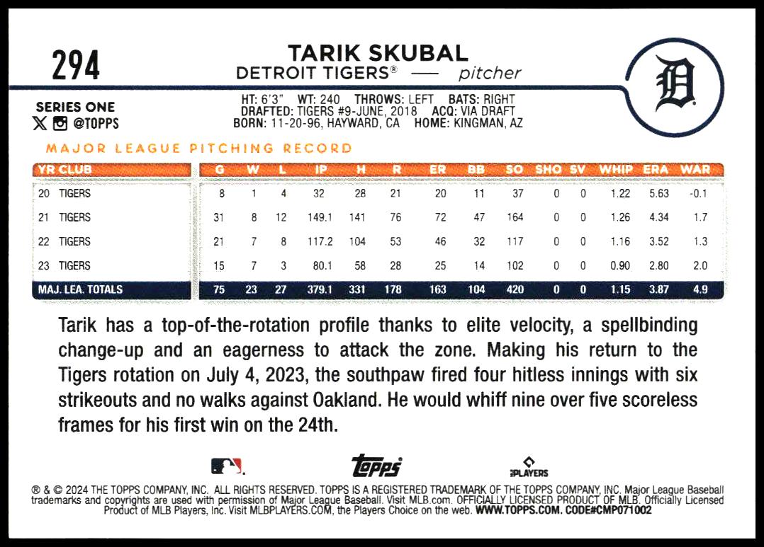This Baseball card, from 2024 is part of the Topps Series 1 card set. Tarik Skubal is featured and has a card number of 294.