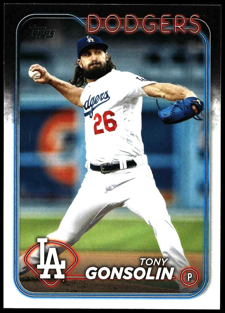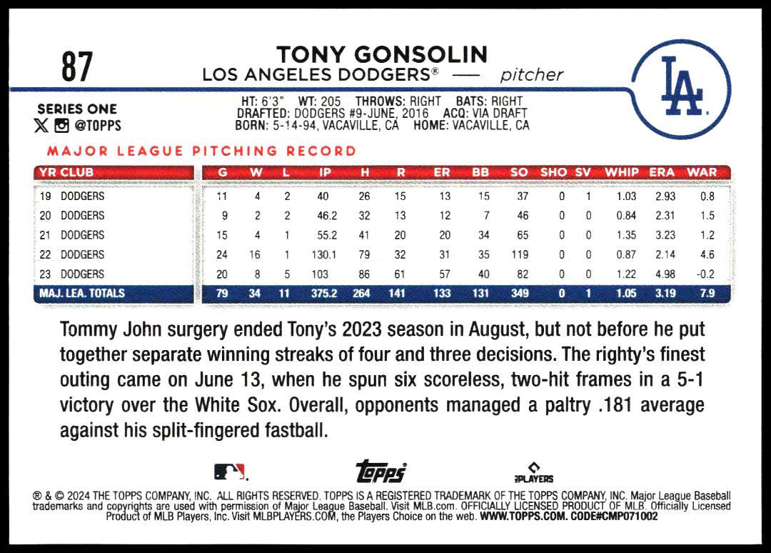 This Baseball card, from 2024 is part of the Topps Series 1 card set. Tony Gonsolin is featured and has a card number of 87.