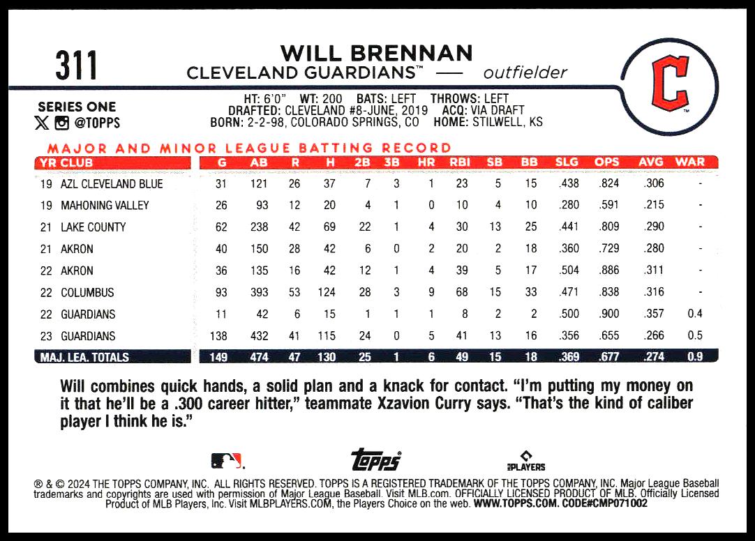 This BaseballΒ card, from 2024 is part of the Topps Series 1Β card set. Will Brennan is featured and has a card number of 311.