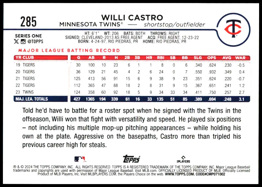 This Baseball card, from 2024 is part of the Topps Series 1 card set. Willi Castro is featured and has a card number of 285.