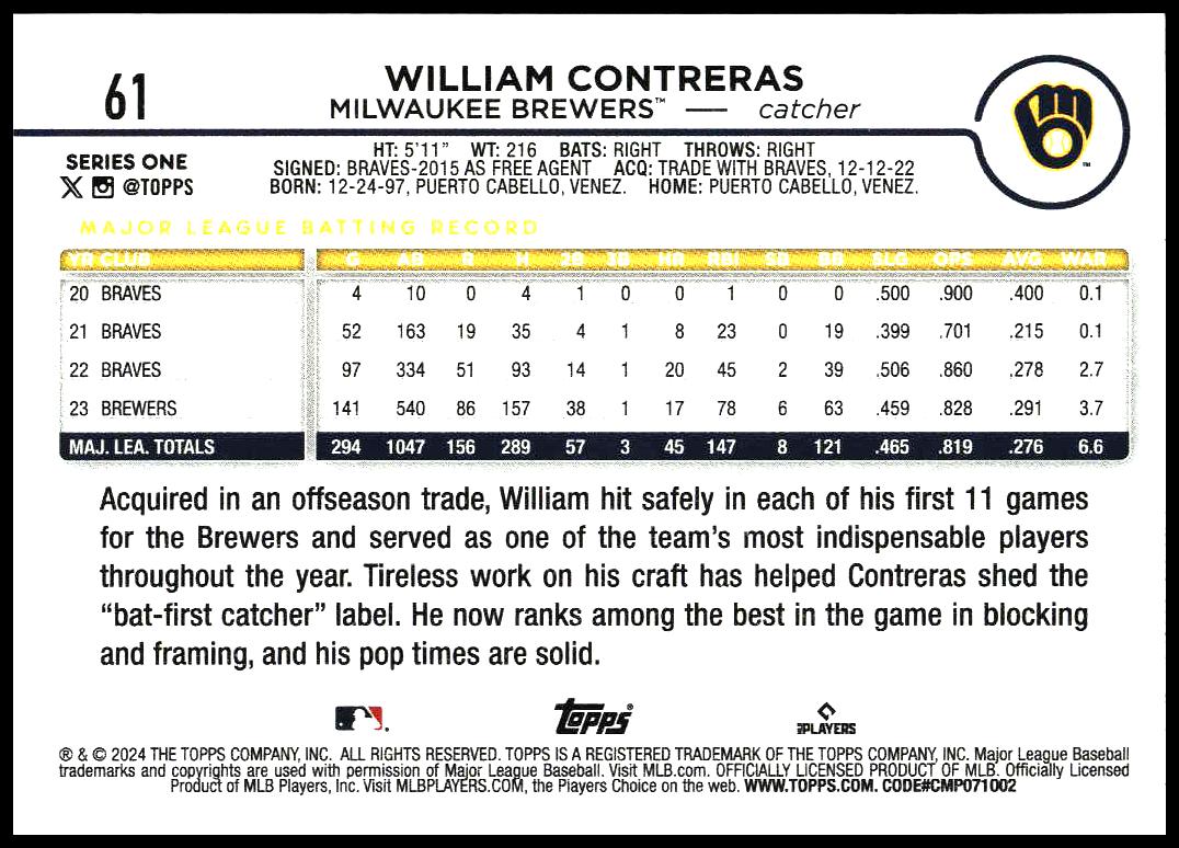 This Baseball card, from 2024 is part of the Topps Series 1 card set. William Contreras is featured and has a card number of 61.