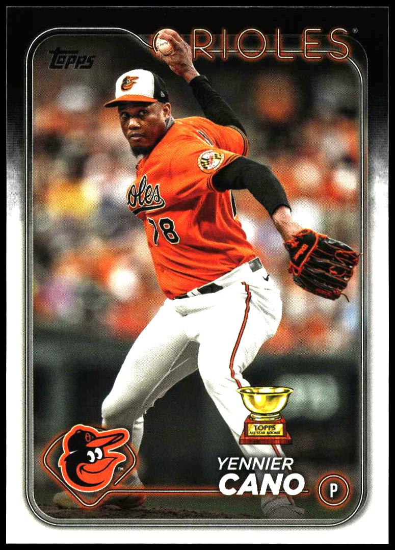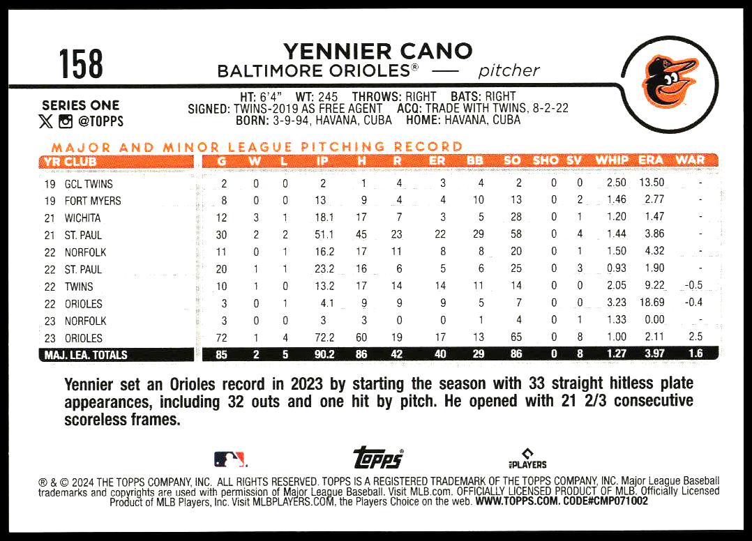 This Baseball card, from 2024 is part of the Topps Series 1 card set. Yennier Cano is featured and has a card number of 158.