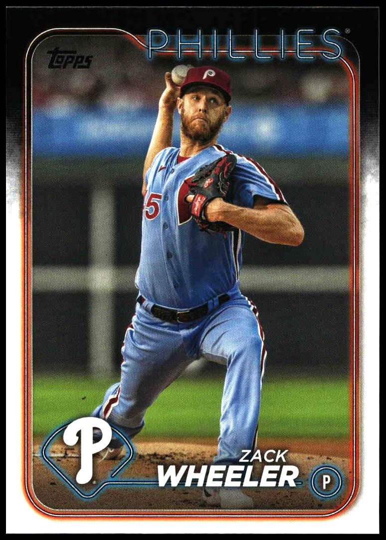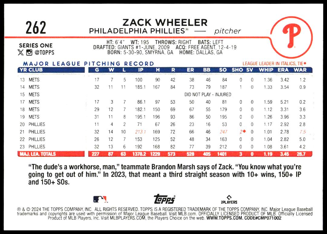 This Baseball card, from 2024 is part of the Topps Series 1 card set. Zack Wheeler is featured and has a card number of 262.