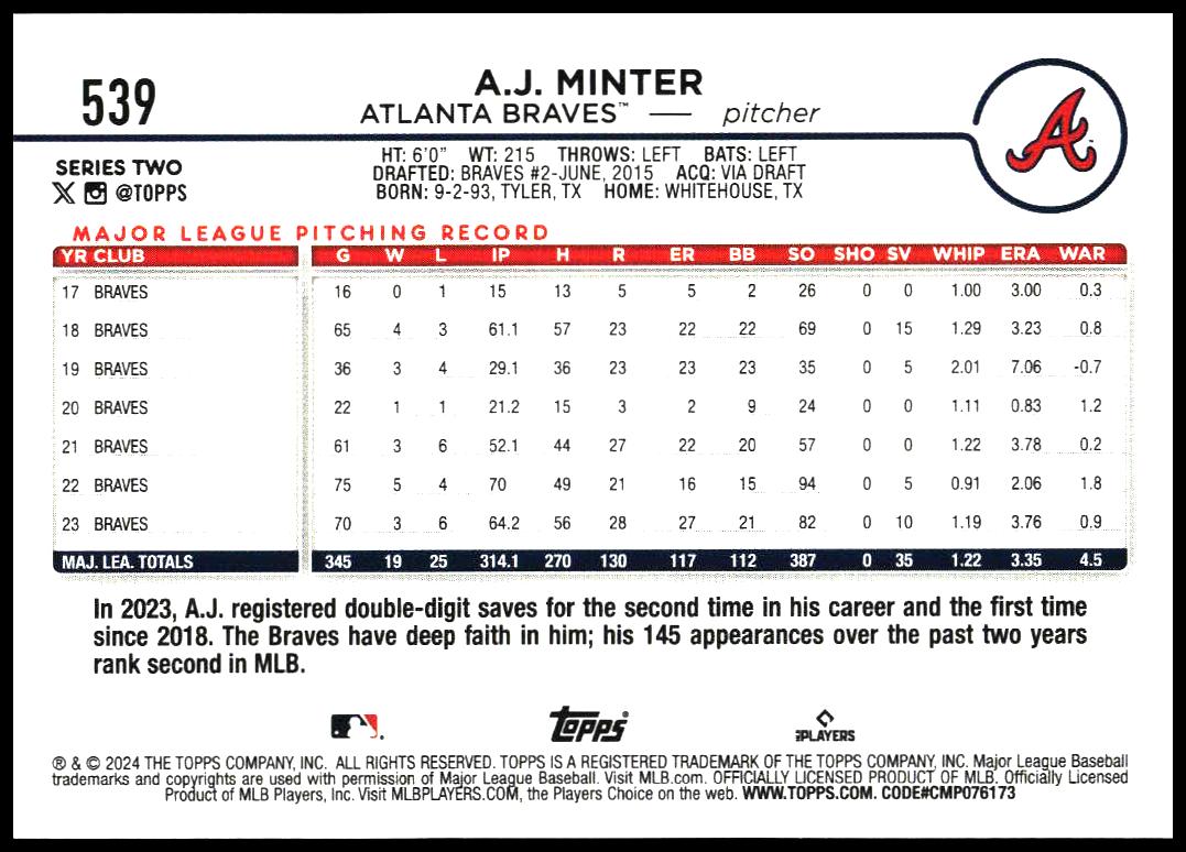 This BaseballΒ card, from 2024 is part of the Topps Series 2Β card set. A.J. Minter is featured and has a card number of 539.