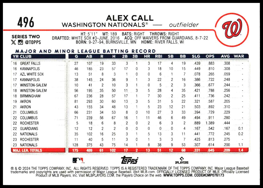This Baseball card, from 2024 is part of the Topps Series 2 card set. Alex Call is featured and has a card number of 496.