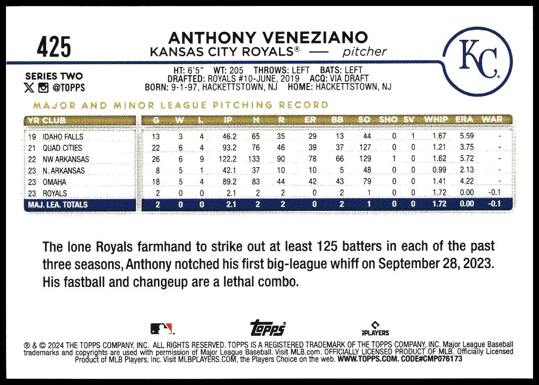 This Baseball card, from 2024 is part of the Topps Series 2 card set. Anthony Veneziano is featured and has a card number of 425.
