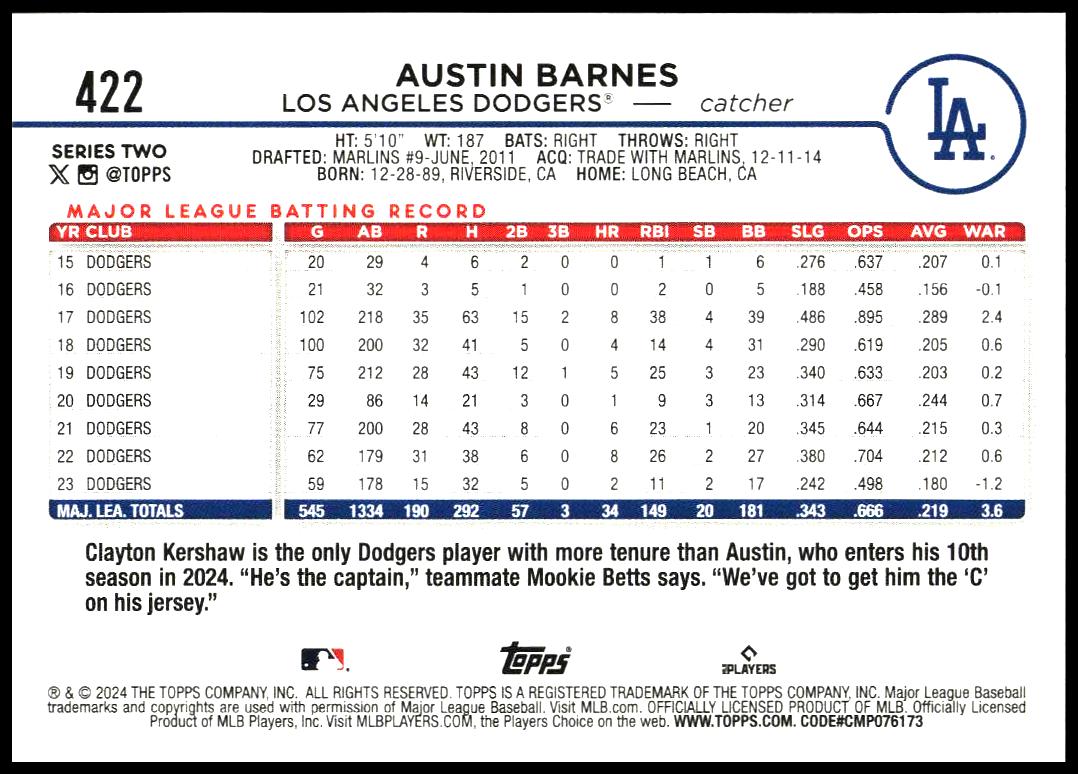 This BaseballΒ card, from 2024 is part of the Topps Series 2Β card set. Austin Barnes is featured and has a card number of 422.