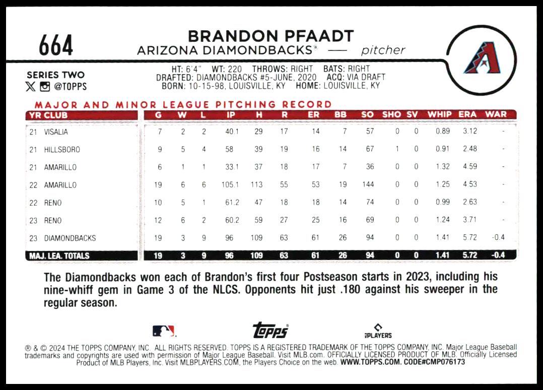 This Baseball card, from 2024 is part of the Topps Series 2 card set. Brandon Pfaadt is featured and has a card number of 664.