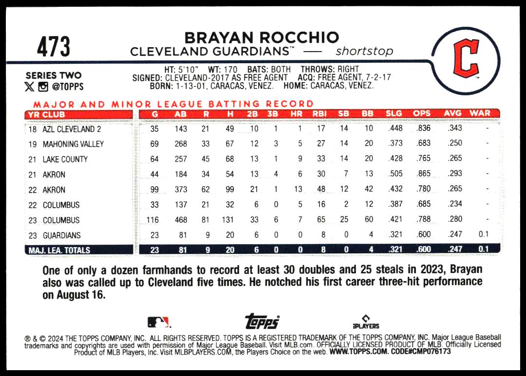 This BaseballΒ card, from 2024 is part of the Topps Series 2Β card set. Brayan Rocchio is featured and has a card number of 473.