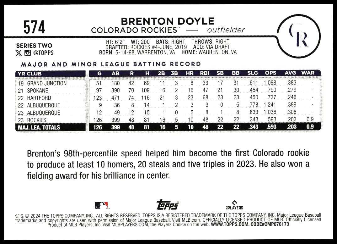 This Baseball card, from 2024 is part of the Topps Series 2 card set. Brenton Doyle is featured and has a card number of 574.