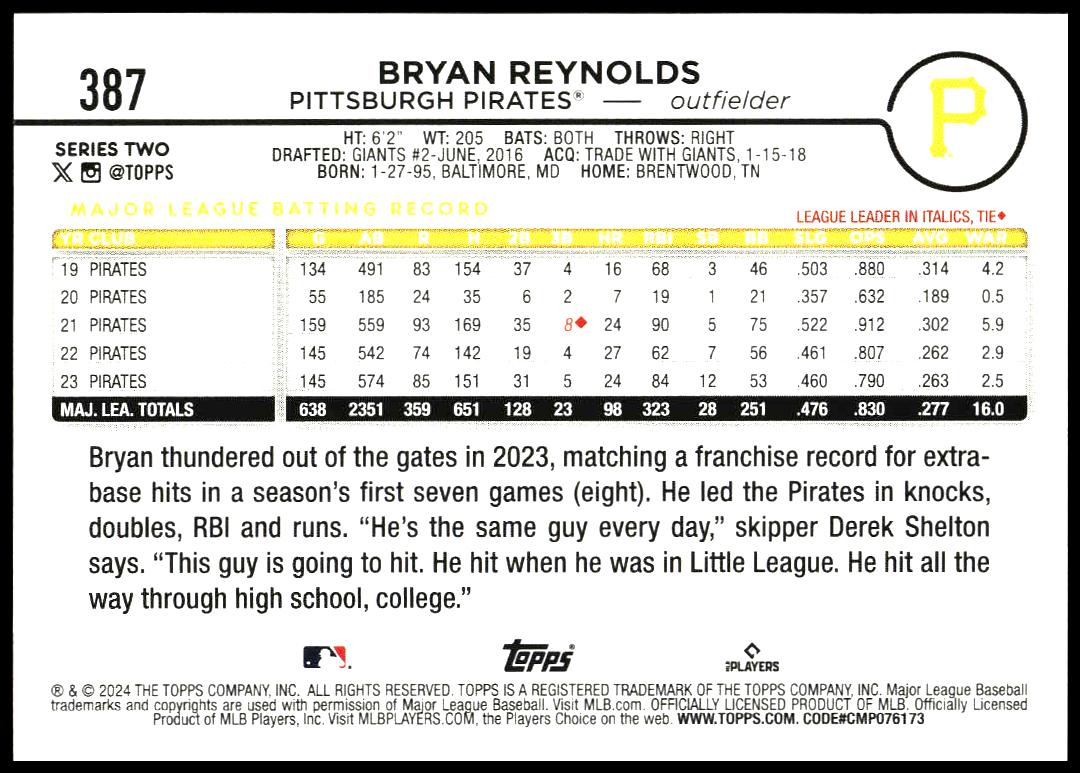 This BaseballΒ card, from 2024 is part of the Topps Series 2Β card set. Bryan Reynolds is featured and has a card number of 387.