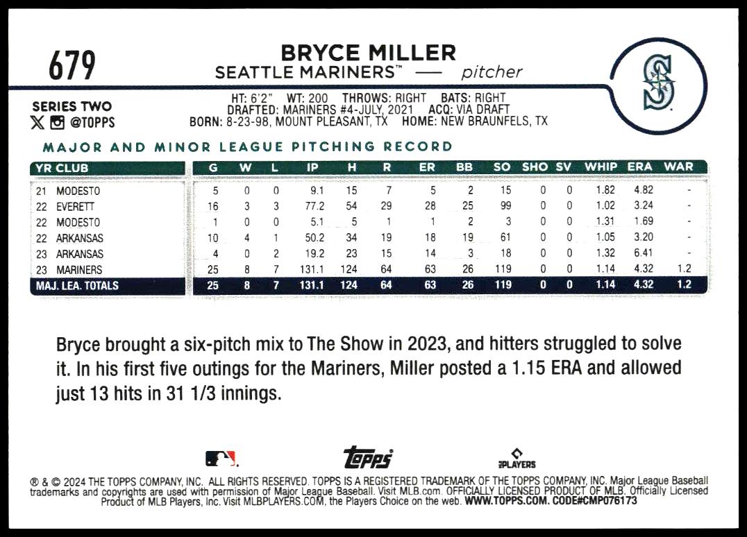 This Baseball card, from 2024 is part of the Topps Series 2 card set. Bryce Miller is featured and has a card number of 679.