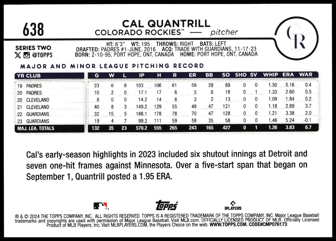 This BaseballΒ card, from 2024 is part of the Topps Series 2Β card set. Cal Quantrill is featured and has a card number of 638.