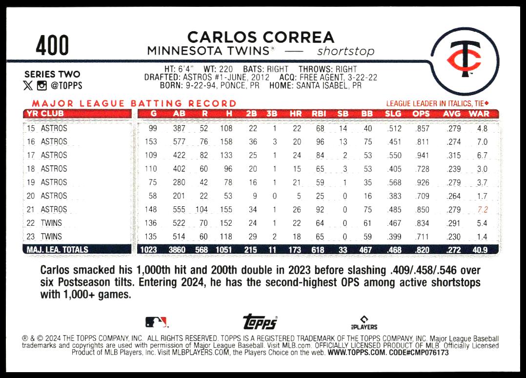 This BaseballΒ card, from 2024 is part of the Topps Series 2Β card set. Carlos Correa is featured and has a card number of 400.