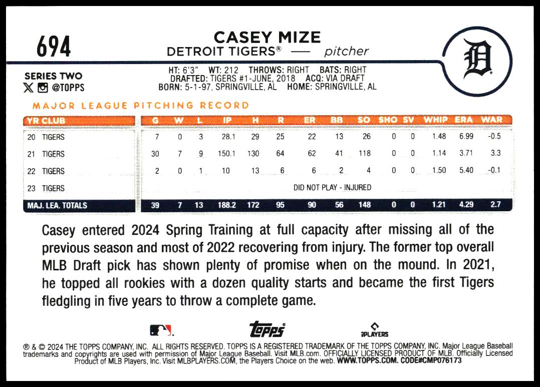 This BaseballΒ card, from 2024 is part of the Topps Series 2Β card set. Casey Mize is featured and has a card number of 694.