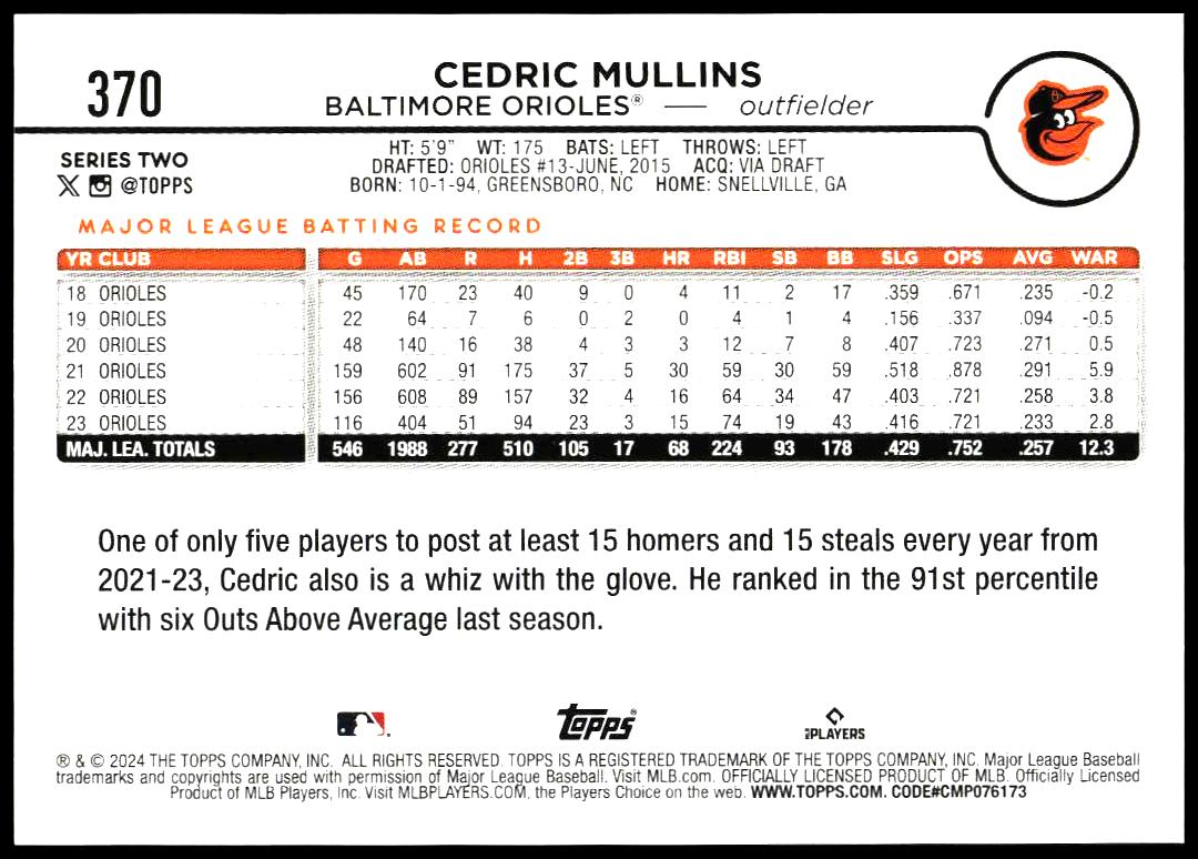 This Baseball card, from 2024 is part of the Topps Series 2 card set. Cedric Mullins is featured and has a card number of 370.