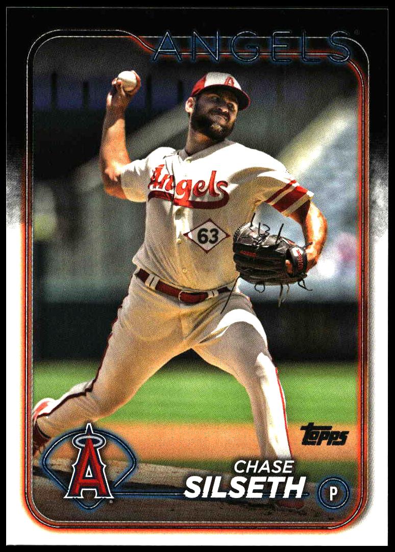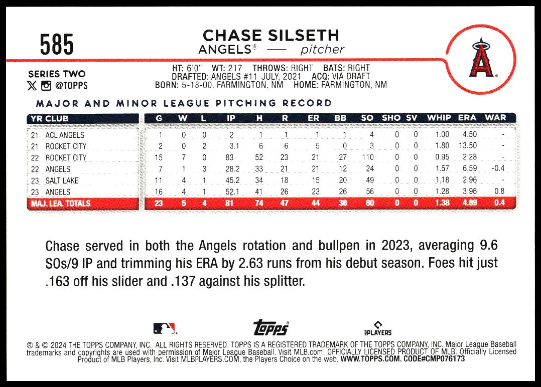 This Baseball card, from 2024 is part of the Topps Series 2 card set. Chase Silseth is featured and has a card number of 585.