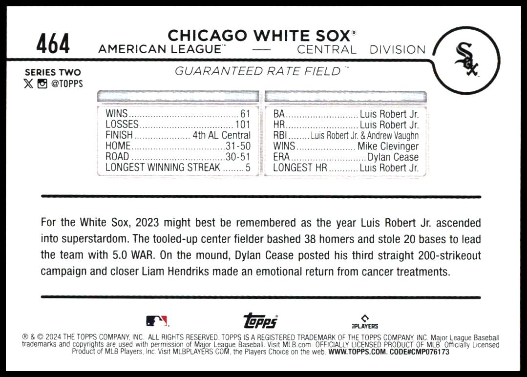 This Baseball card, from 2024 is part of the Topps Series 2 card set. Chicago White Sox is featured and has a card number of 464.