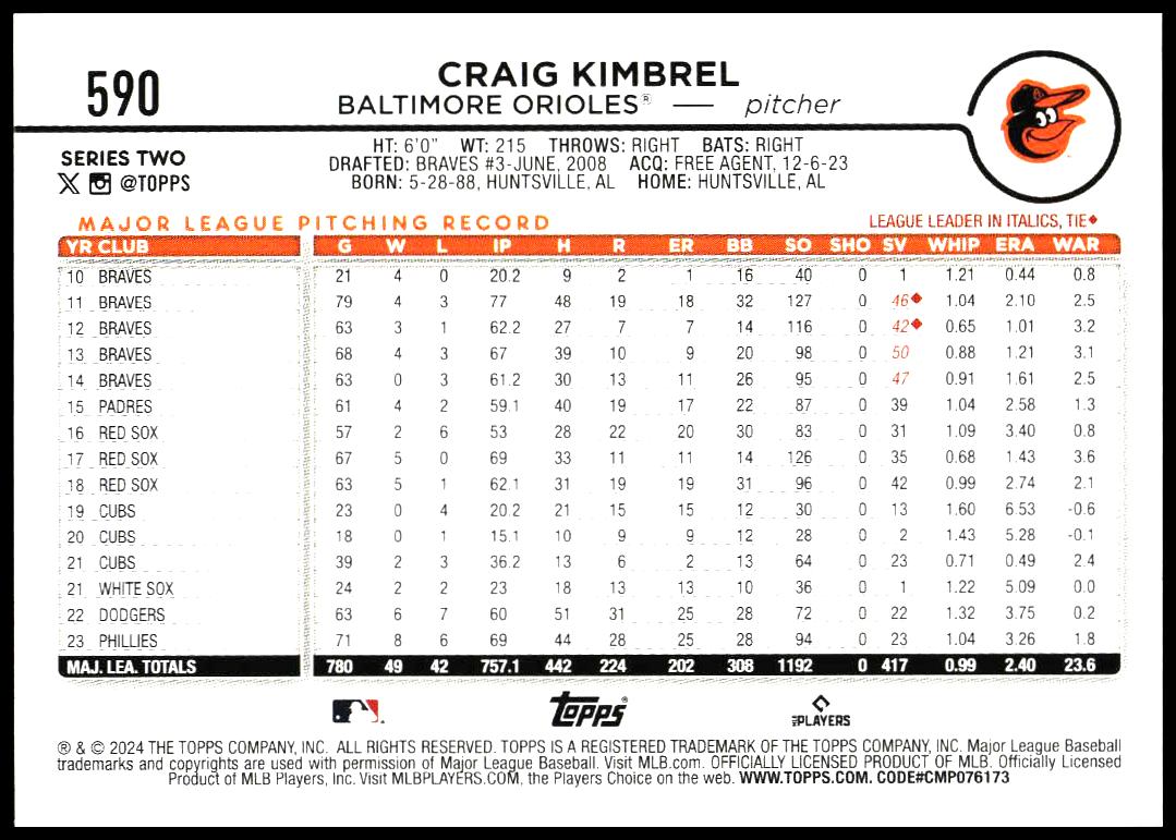 This BaseballΒ card, from 2024 is part of the Topps Series 2Β card set. Craig Kimbrel is featured and has a card number of 590.
