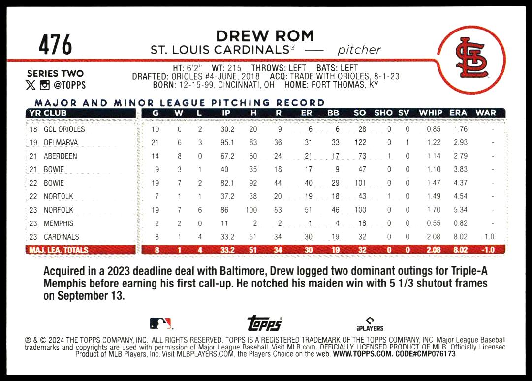 This Baseball card, from 2024 is part of the Topps Series 2 card set. Drew Rom is featured and has a card number of 476.