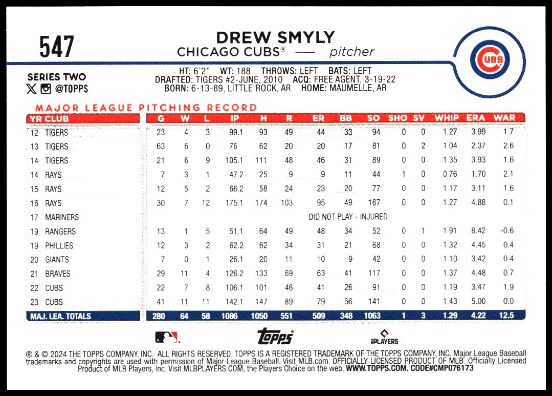 This BaseballΒ card, from 2024 is part of the Topps Series 2Β card set. Drew Smyly is featured and has a card number of 547.