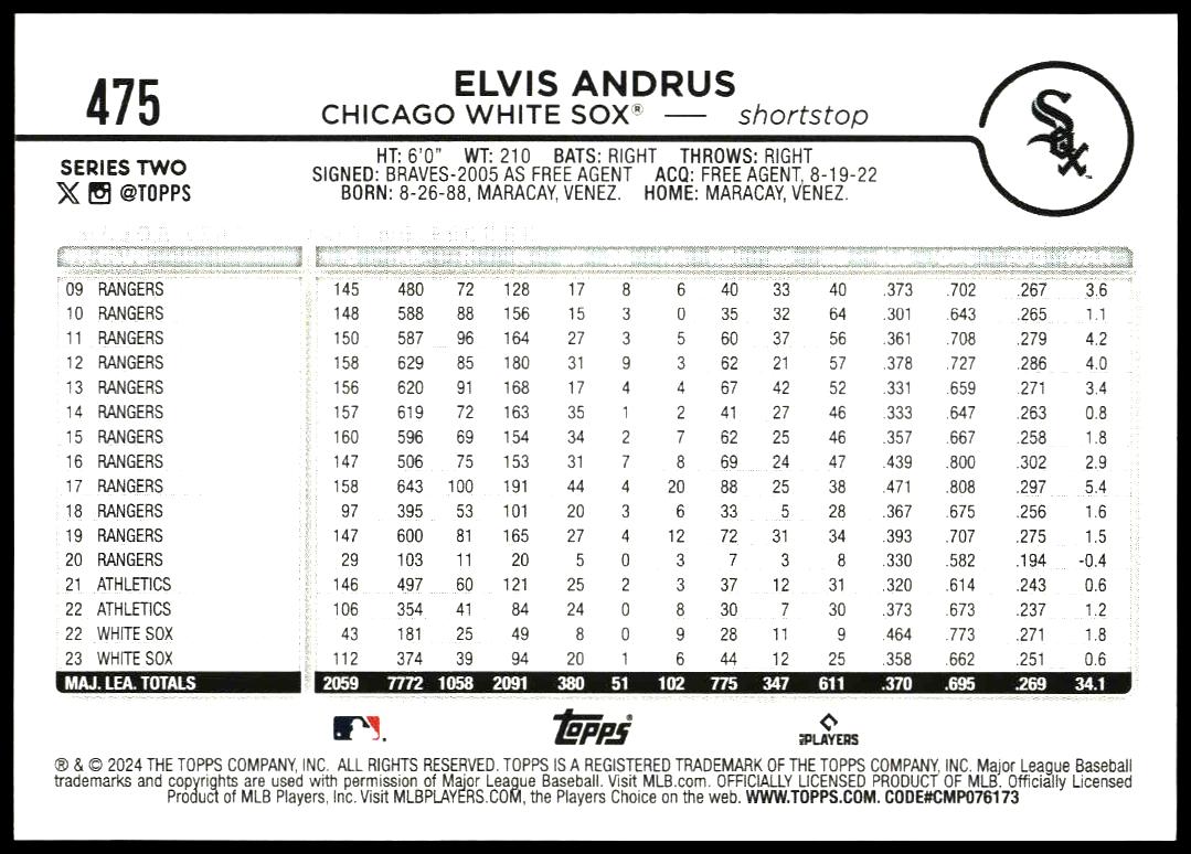 This Baseball card, from 2024 is part of the Topps Series 2 card set. Elvis Andrus is featured and has a card number of 475.