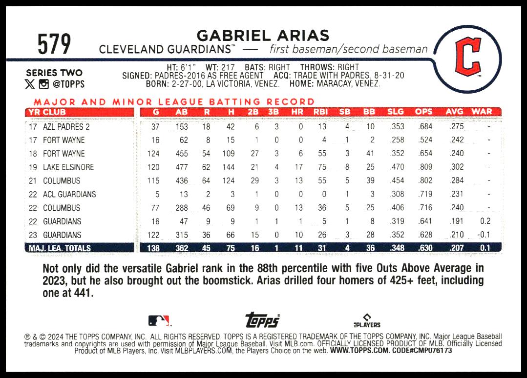 This BaseballΒ card, from 2024 is part of the Topps Series 2Β card set. Gabriel Arias is featured and has a card number of 579.
