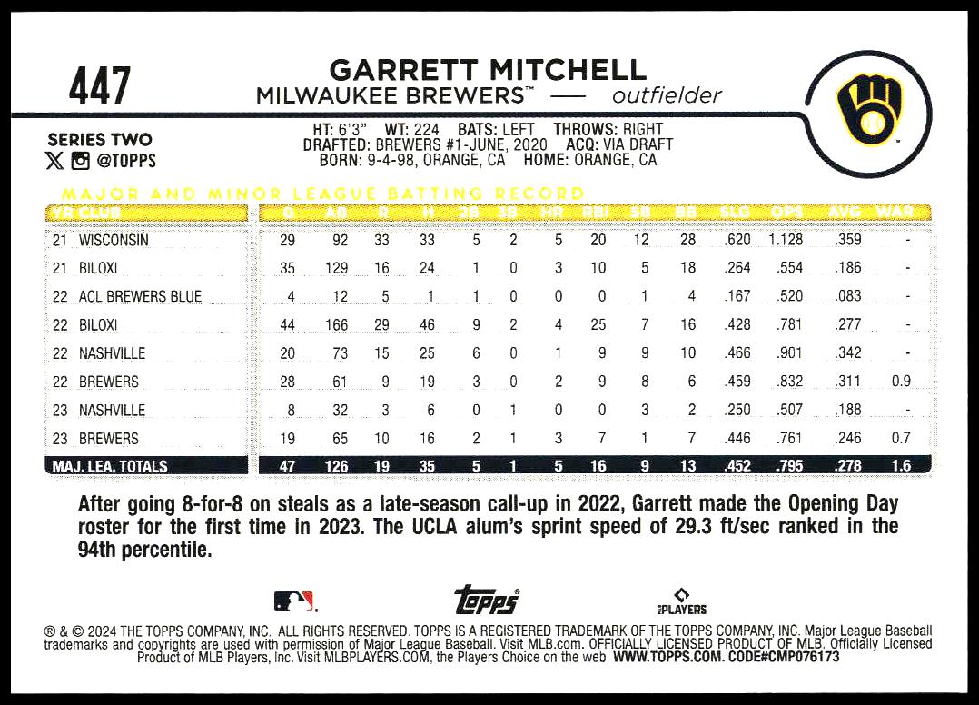 This BaseballΒ card, from 2024 is part of the Topps Series 2Β card set. Garrett Mitchell is featured and has a card number of 447.