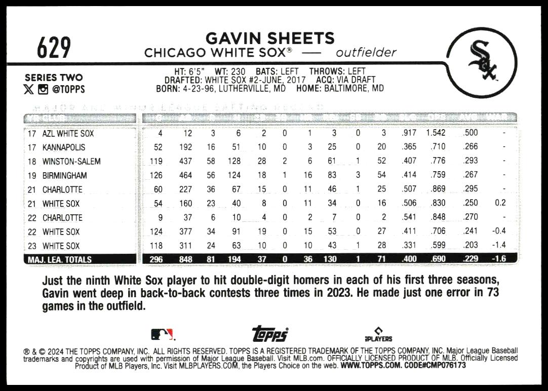 This BaseballΒ card, from 2024 is part of the Topps Series 2Β card set. Gavin Sheets is featured and has a card number of 629.