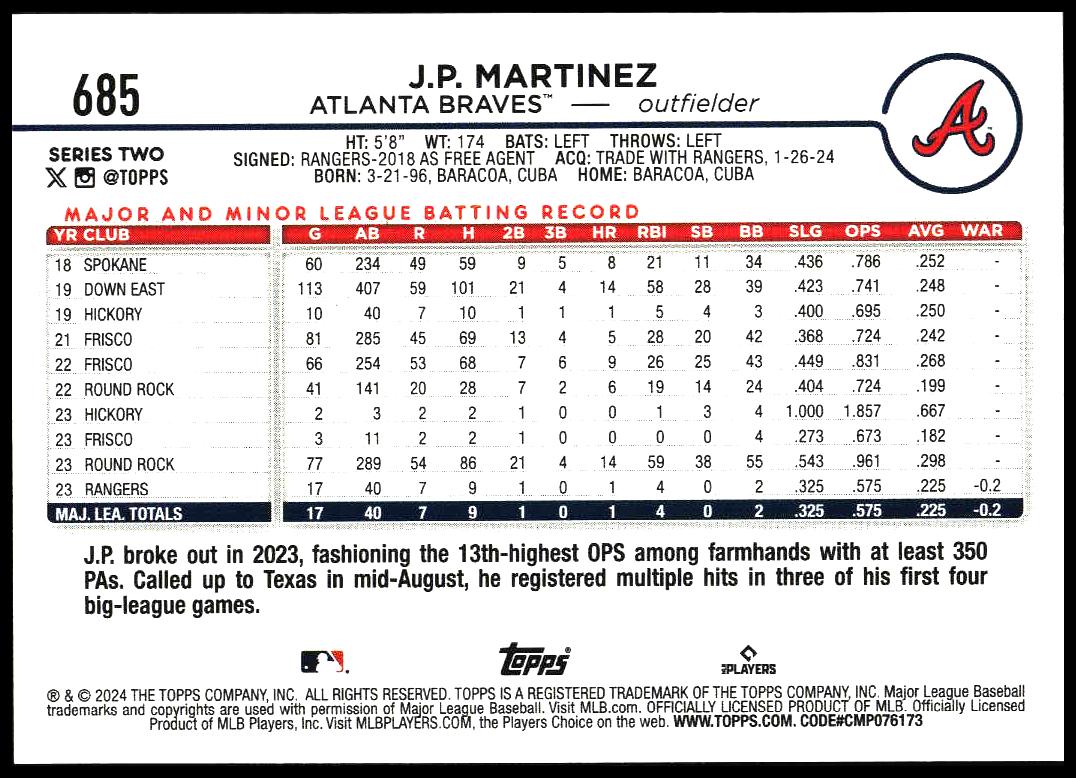 This Baseball card, from 2024 is part of the Topps Series 2 card set. J.P. Martinez is featured and has a card number of 685.
