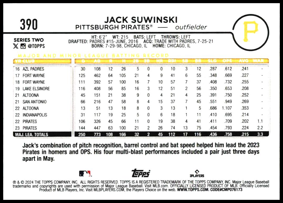 This Baseball card, from 2024 is part of the Topps Series 2 card set. Jack Suwinski is featured and has a card number of 390.