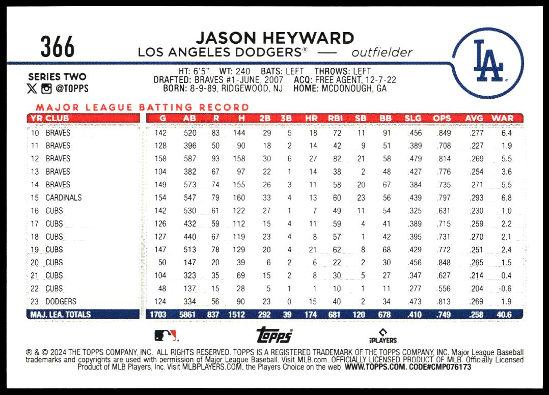 This BaseballΒ card, from 2024 is part of the Topps Series 2Β card set. Jason Heyward is featured and has a card number of 366.