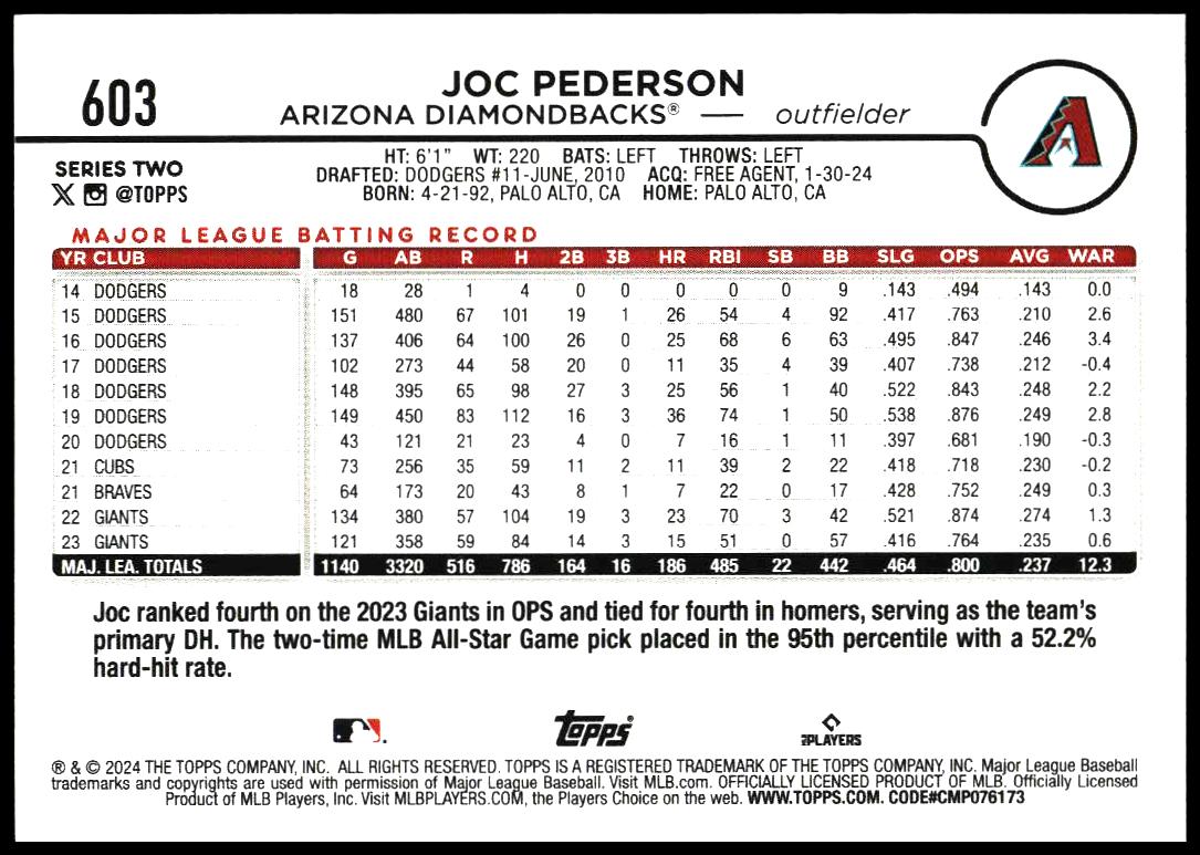 This BaseballΒ card, from 2024 is part of the Topps Series 2Β card set. Joc Pederson is featured and has a card number of 603.