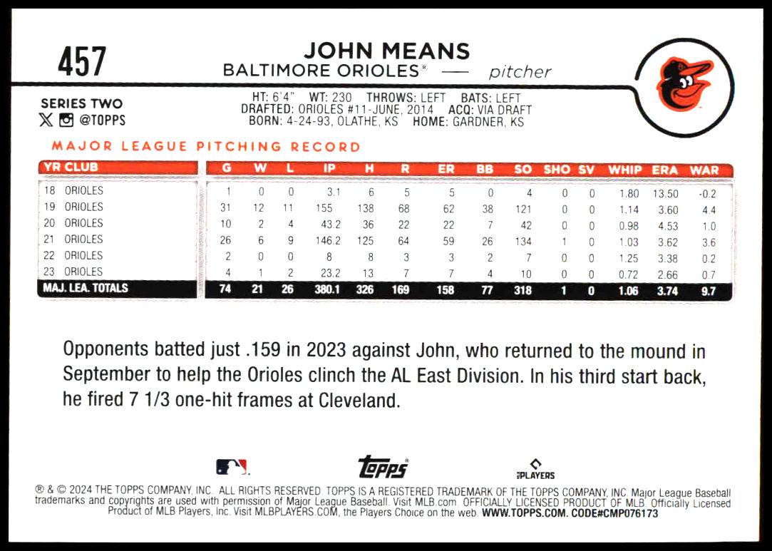 This Baseball card, from 2024 is part of the Topps Series 2 card set. John Means is featured and has a card number of 457.