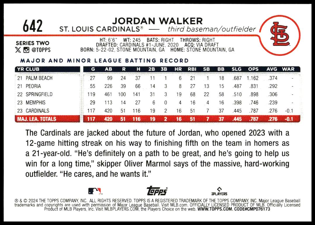 This Baseball card, from 2024 is part of the Topps Series 2 card set. Jordan Walker is featured and has a card number of 642.