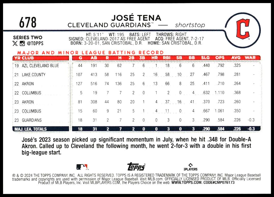 This Baseball card, from 2024 is part of the Topps Series 2 card set. José Tena is featured and has a card number of 678.
