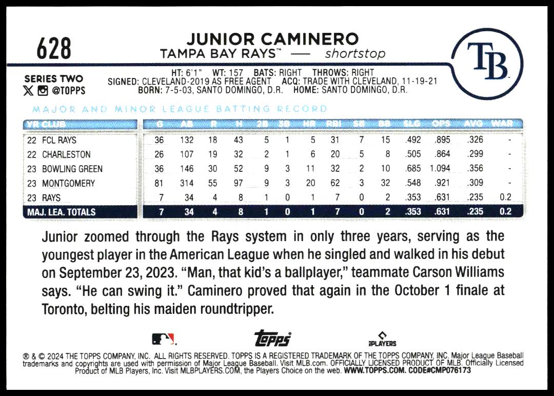 This BaseballΒ card, from 2024 is part of the Topps Series 2Β card set. Junior Caminero is featured and has a card number of 628.