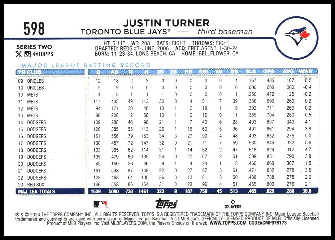 This BaseballΒ card, from 2024 is part of the Topps Series 2Β card set. Justin Turner is featured and has a card number of 598.