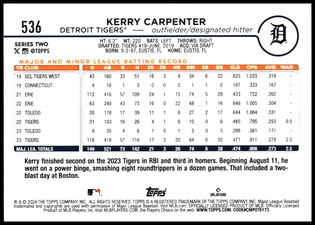 This Baseball card, from 2024 is part of the Topps Series 2 card set. Kerry Carpenter is featured and has a card number of 536.