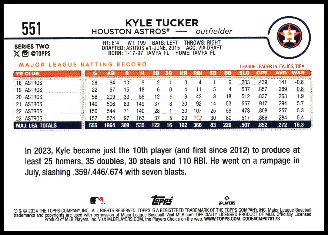 This BaseballΒ card, from 2024 is part of the Topps Series 2Β card set. Kyle Tucker is featured and has a card number of 551.