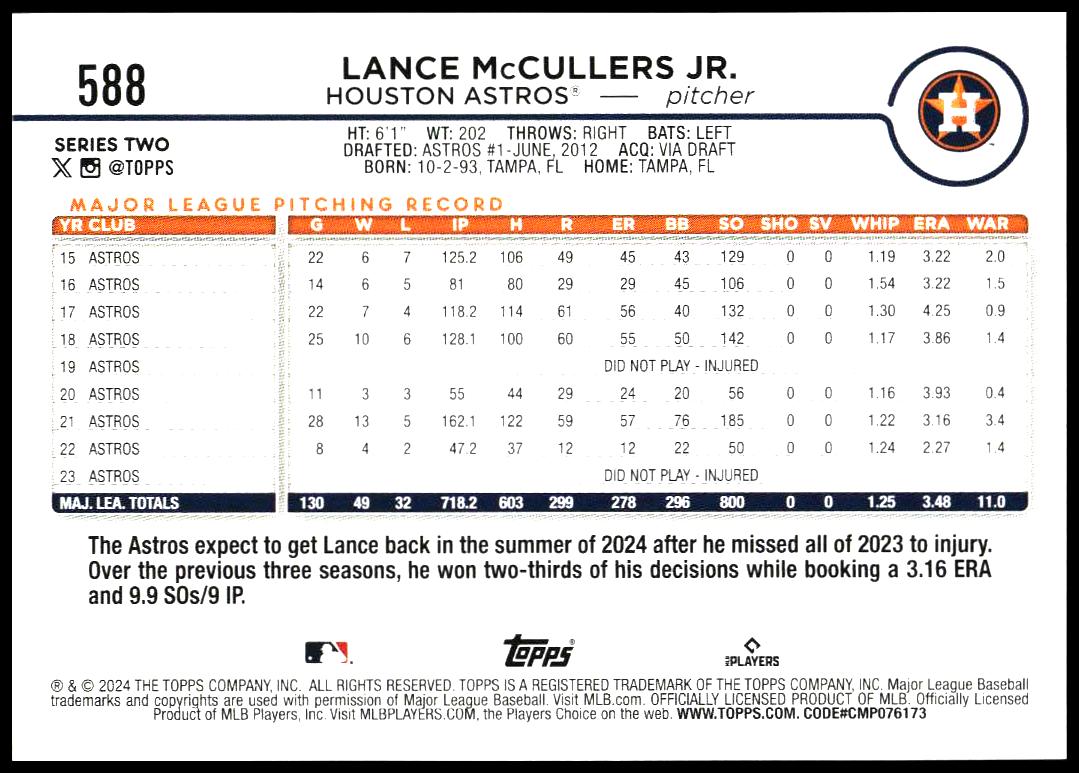 This BaseballΒ card, from 2024 is part of the Topps Series 2Β card set. Lance McCullers Jr. is featured and has a card number of 588.