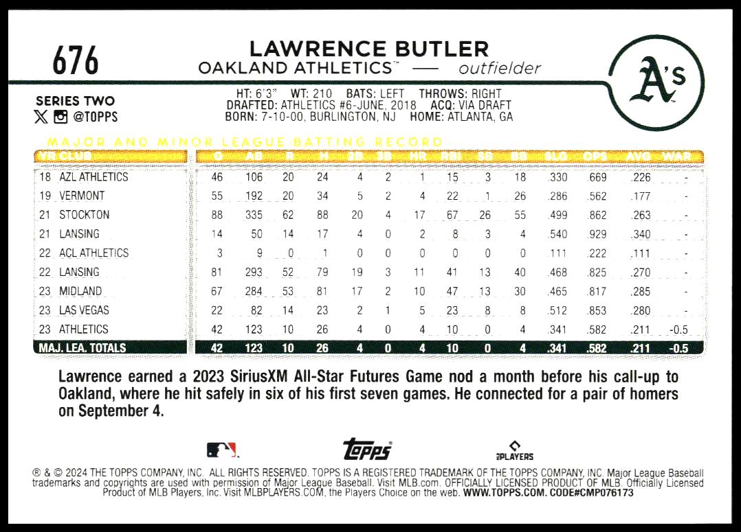 This Baseball card, from 2024 is part of the Topps Series 2 card set. Lawrence Butler is featured and has a card number of 676.